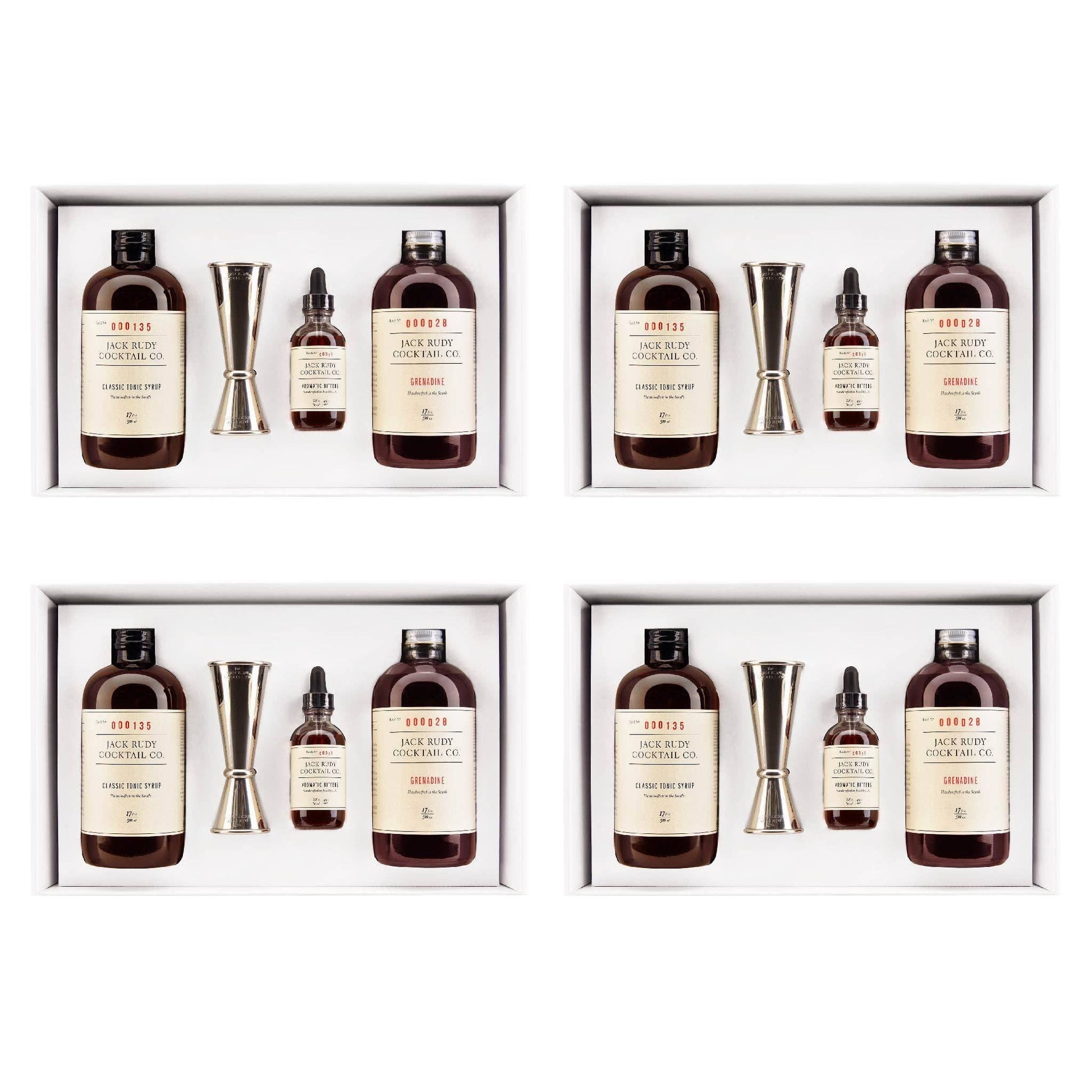 This is one of our essential Jack Rudy kits for the home bar enthusiast, and a perfect component to retail gift selections. The Jack Pack includes a 17 oz. bottle of our Classic Tonic Syrup, a 17 oz. bottle of our Grenadine, a 2 oz. bottle of our Aromatic Bitters, and a Jigger. These small batch products are packed nicely in a beautiful, white gift box, perfect for holiday gift giving, as a housewarming gift, or even as the final piece of your home bar puzzle. Add booze and you’re set; add some fine folks and you’ve got a proper soiree.