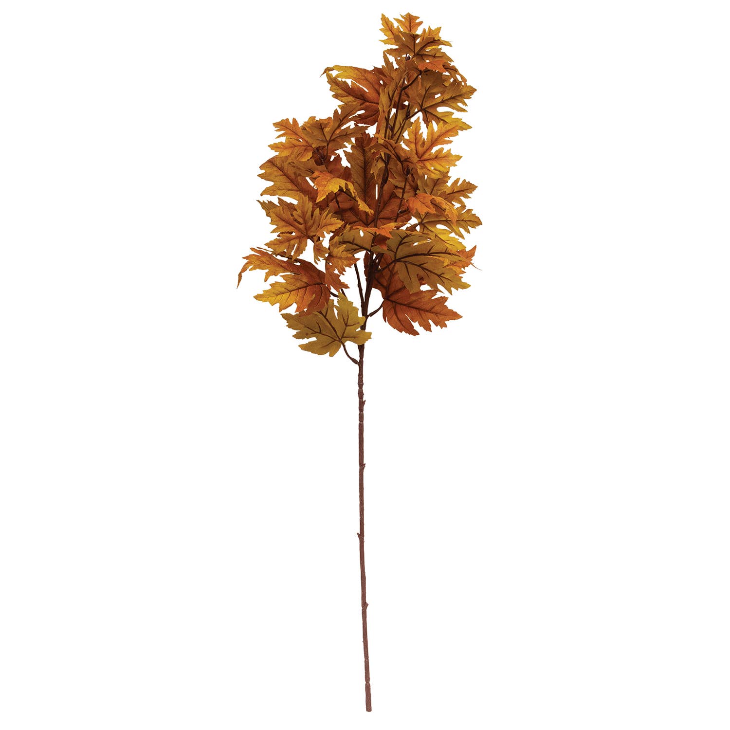 Conjure up thoughts of cooling temperatures and changing leaves with the Late Fall Turning Maple Leaf Spray, 36.5". This 36.5" spray features fabric maple leaves in varying shades of orange and gold with intricate detailing. It features a long, plastic brown stem. This spray will be right at home among farmhouse decor and looks great accenting pumpkins or tucked into buckets or milk cans.