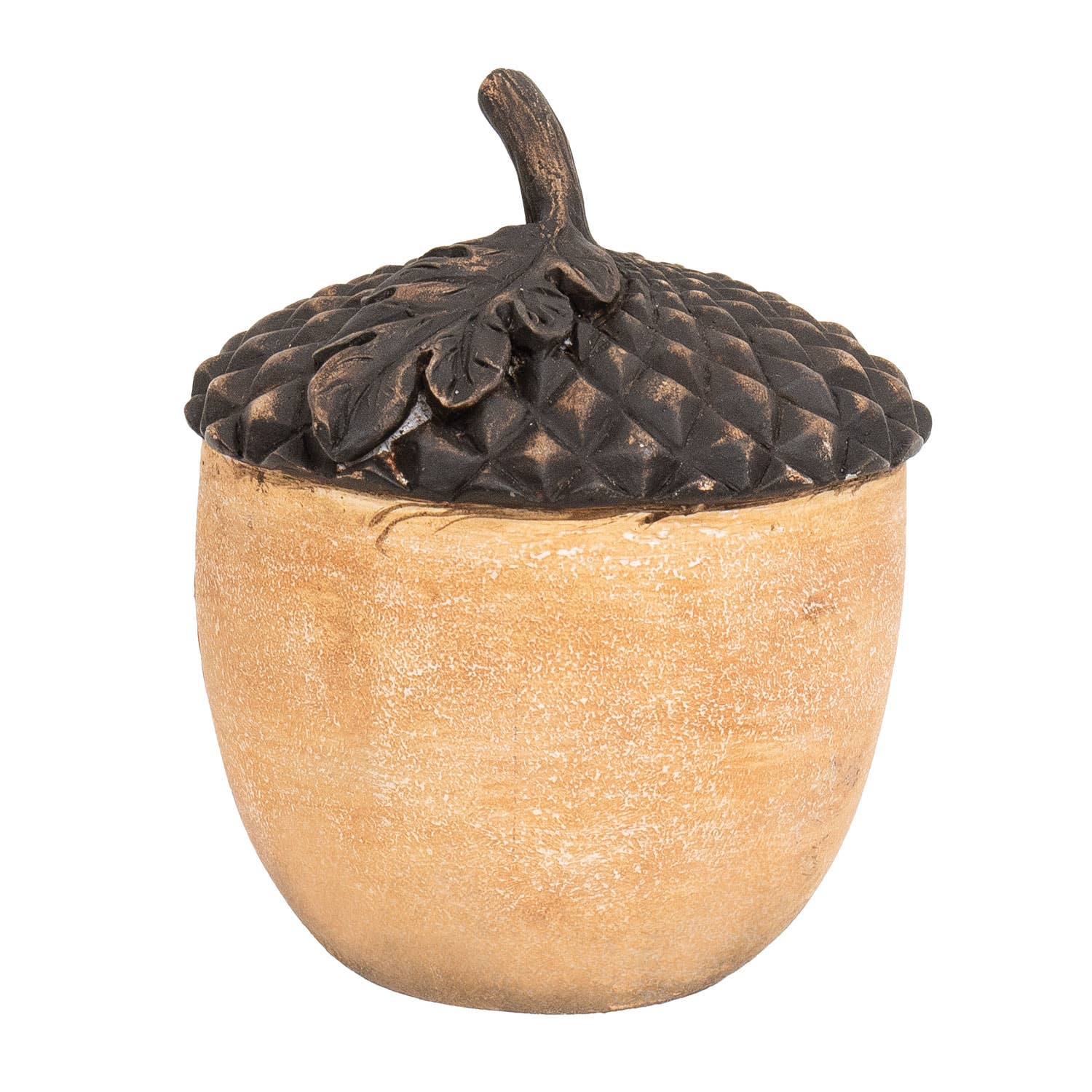 Bring a little Fall-time delight to the farmhouse this Autumn with the Resin Acorn Sitter. This large resin acorn has a crosshatched top in dark brown with a stem and oak leaf. The body is mildly textured with a light golden brown tone. The acorn is 4" in diameter and 5" tall. Easily finish off sign displays by placing this darling acorn to one side with a Fall floral spray or bead garland.