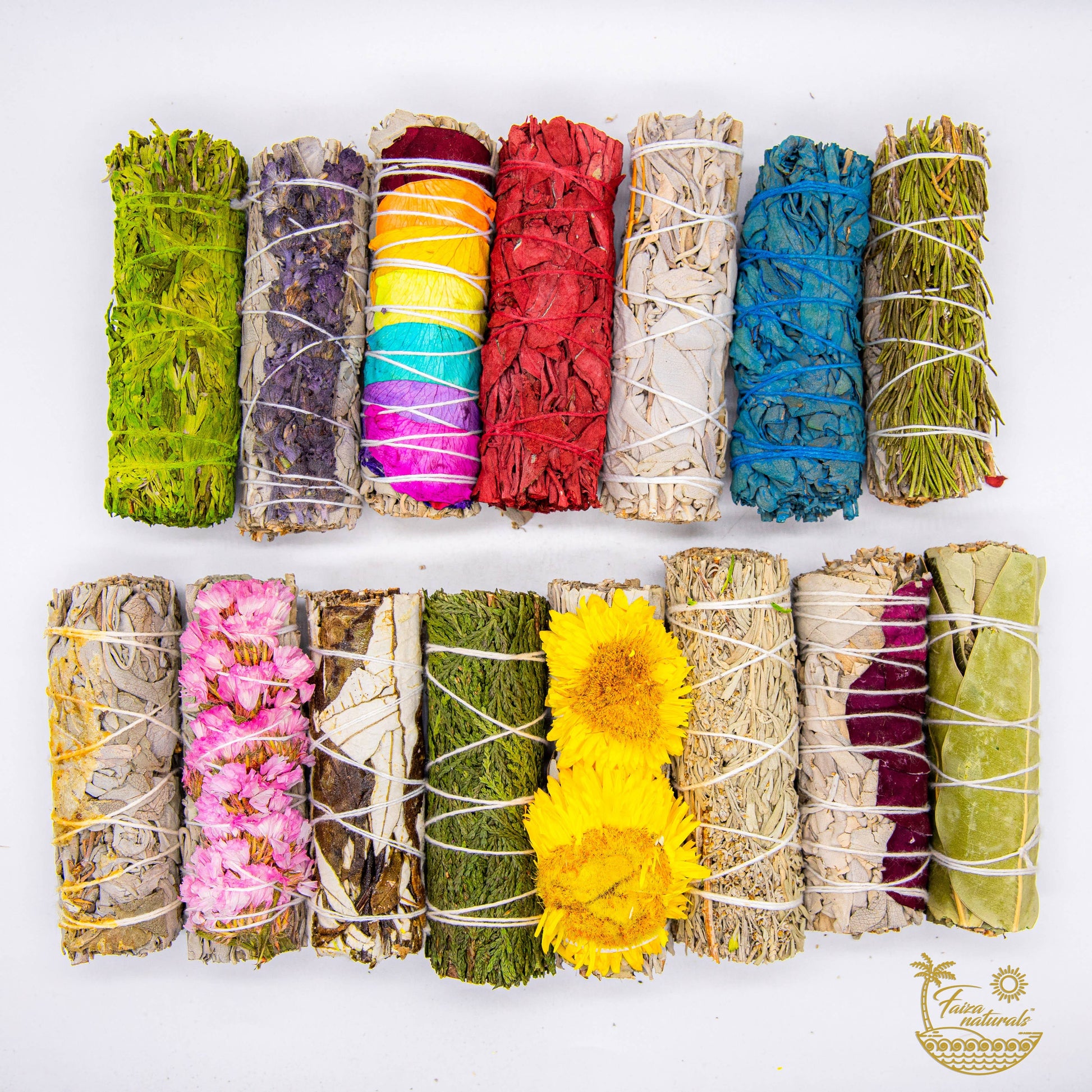 Includes: White Sage, Blue Sage, 7 Chakra Rose with White Sage, Yerba Santa, Cedar, Rosemary with White Sage, Eucalyptus with White Sage, Sunflower with White Sage, Lavender with White Sage, Pink Sinuata with White Sage, Dragons Blood White Sage, Nag Champa White Sage, Copal Resin with White Sage, Patchouli Blue Sage and Rose Petal with White Sage.